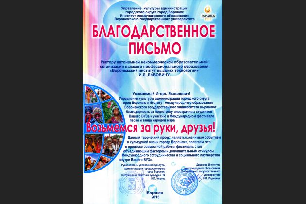 Управление культуры администрации городского округа город Воронеж и Институт международного образования ВГУ выразили благодарность ректору Воронежского института высоких технологий Игорю Яковлевичу Львовичу за подготовку иностранных студентов к участию в Международном фестивале песни и танца народов мира.