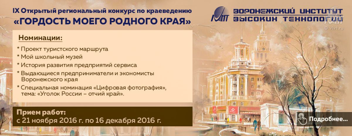 С 21 ноября в ВИВТ стартовал ежегодный IX открытый региональный конкурс по краеведению «Гордость моего родного края». В Конкурсе принимают участие ученики 8-11 классов общеобразовательных учреждений, учреждений дополнительного образования и среднего профессионального образования г. Воронеж, Воронежской области и других регионов.